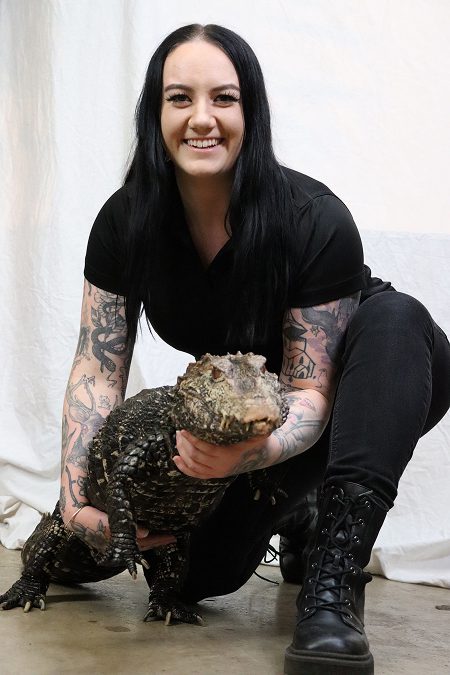 After studying Theatre Production in college, Abi was forced to rethink her career when the pandemic hit. She took up taxidermy and began volunteering at an exotic animal rescue to better understand anatomy—and discovered a deep love for live animals. One of her most unforgettable experiences was caring for a senior tegu lizard named Teddy, abandoned and near death. Nursing him back to health sparked her passion for animal advocacy and public education.